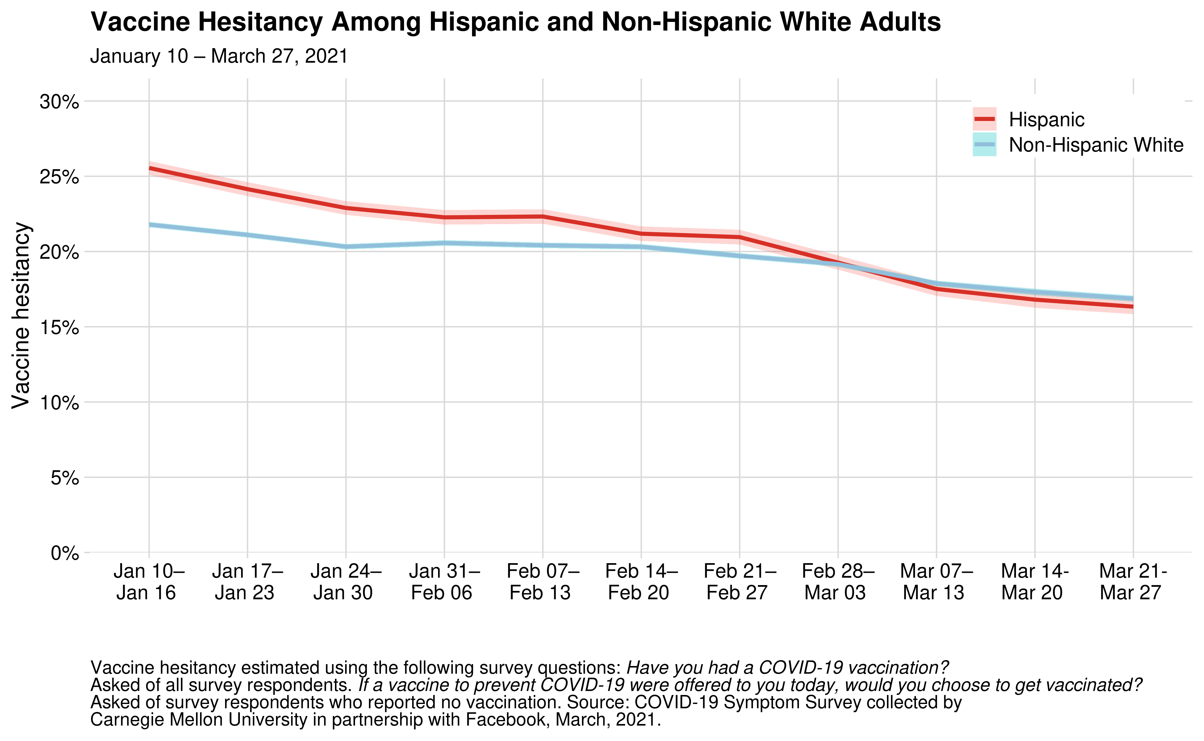 During the week of March 21-27, 16.3% of Hispanic adults reported being vaccine-hesitant. This hesitancy rate is down 9.3 percentage points from early January, when it was 25.6%.