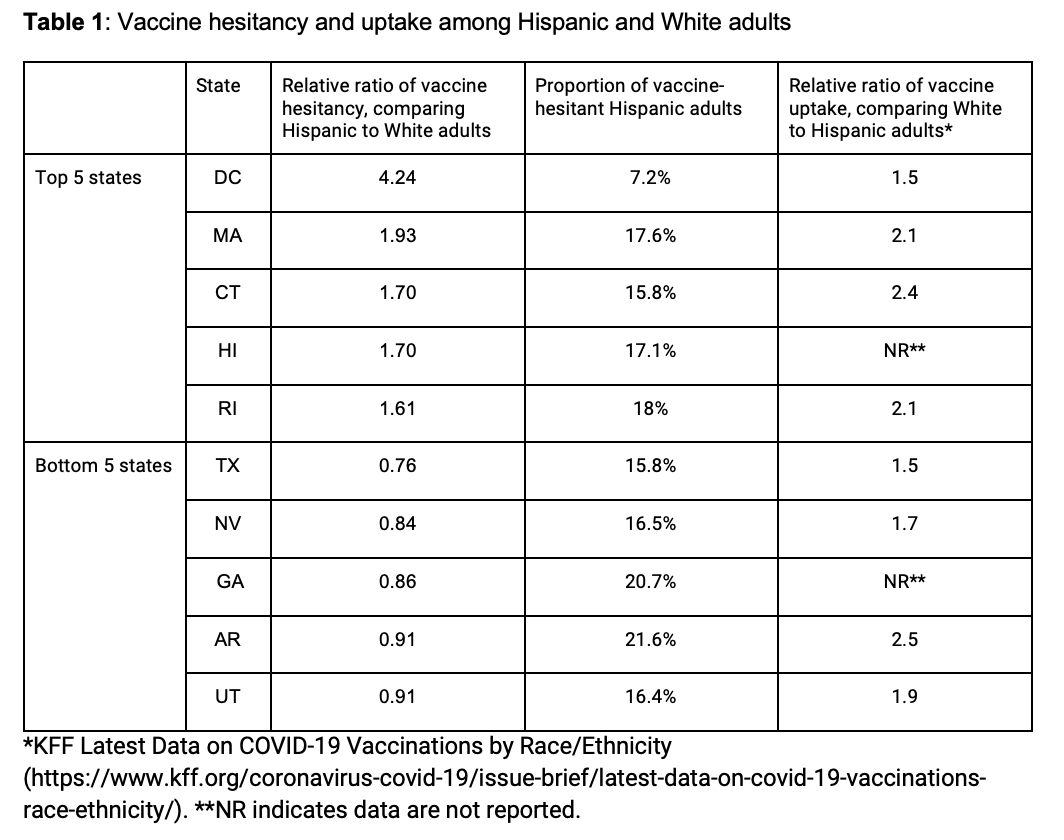 The large disparity in vaccine hesitancy observed in MA, CT, RI, PA, MI, and CO mirrors disparities in vaccine uptake. These states have one of the largest disparities in vaccination rates in the country (White-to-Hispanic vaccination rate ratios > 2.0 according to KFF), which suggests that addressing the disparity in hesitancy among unvaccinated adults may also help address the disparity in vaccine uptake between Hispanic and White adults.